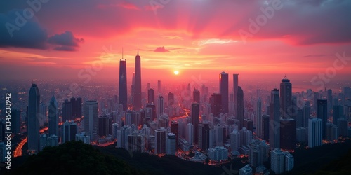 © BELLAMKONDA SOWJANYA, Fototapeta premium A cityscape at sunset, with towering skyscrapers and a vibrant sky