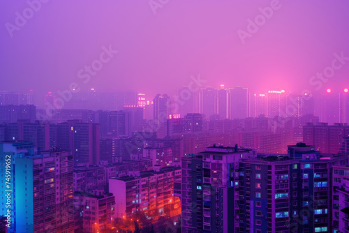 © imlane, Obraz premium A cityscape in purple and pink lit up at dusk.