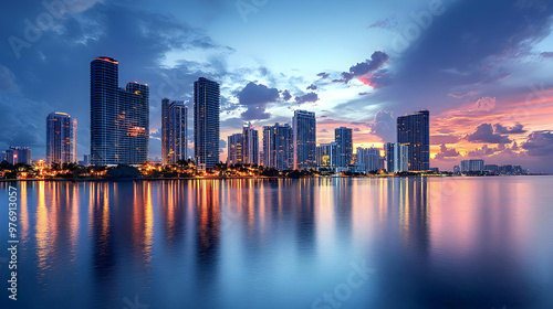 Fototapeta premium A cityscape of high-rise buildings along the waterfront at dusk with colorful...