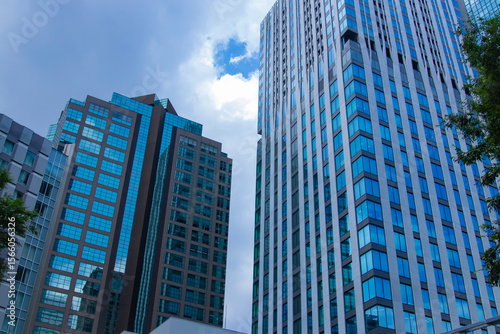 © tokyovisionaryroom, Naklejka premium A cityscape of moving cloud reflecting the office building at the business town