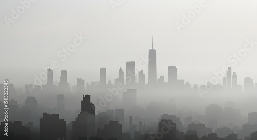 © Aulia, Naklejka premium A cityscape shrouded in fog, with skyscrapers silhouetted against the hazy sky. The tallest building dominates the skyline.