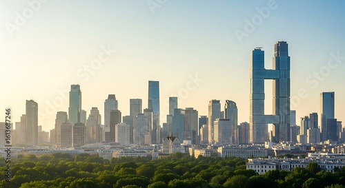 © Dinar, Fototapeta premium A cityscape view featuring numerous skyscrapers rising above a green urban park under a bright sky.
