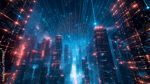 © CtrlN, Obraz premium A cityscape with a blue sky and a bright orange sky