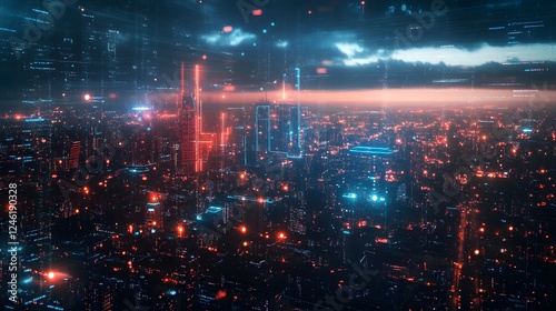 © jiraphat, Fototapeta premium A cityscape with a bright blue sky and a few clouds. The city is lit up with neon lights and the sky is filled with stars. Scene is futuristic and vibrant