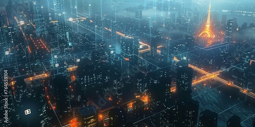 © kiimoshi, Fototapeta premium A cityscape with a bright orange Eiffel Tower in the center
