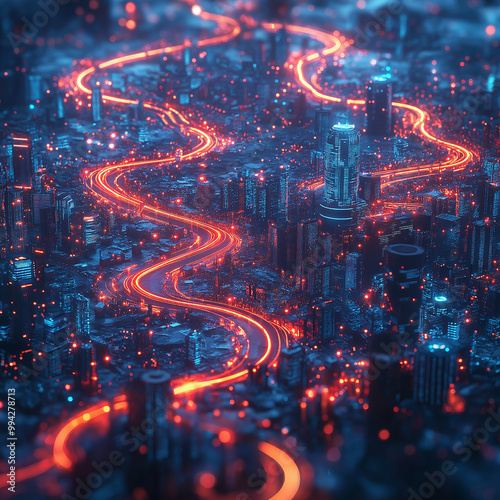 © CtrlN, Obraz premium A cityscape with a long, curving road that is lit up with red lights