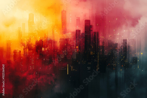 © Butsarakham, Fototapeta premium A cityscape with a red and orange sky. The city is lit up at night, creating a moody and dramatic atmosphere