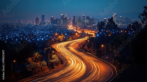 Fototapeta premium A cityscape with communication networks illustrating mobile internet technology for smart grids, 5G, and global business.