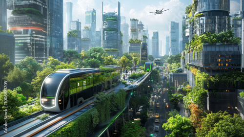 Fototapeta premium A cityscape with green technology integrated, featuring electric buses, solar-powered streetlights, and rooftop gardens on skyscrapers