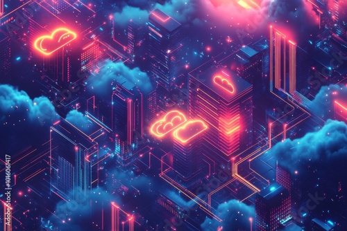 Fototapeta premium A cityscape with neon lights and clouds in the background