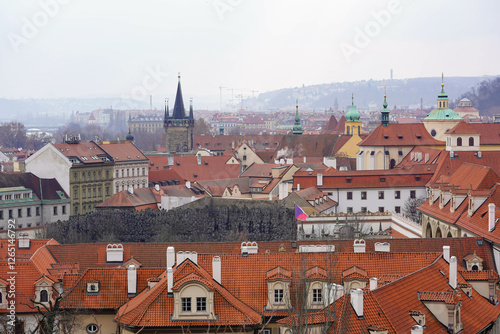 © Tanya, Obraz premium A cityscape with red-tiled rooftops, historic buildings, and church spires under an overcast sky