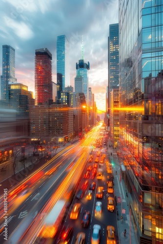 © Media Srock, Fototapeta premium A cityscape with tall buildings and a street view. The buildings are lit up at night, creating a warm and inviting atmosphere. The street is busy with cars and people