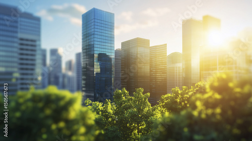 Obraz premium A cityscape with tall glass buildings, greenery, and sunlight.