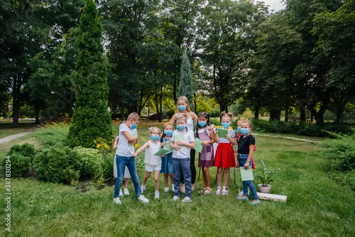 © Andrii, Obraz premium A class of masked school children is engaged in outdoor training during the epidemic. Back to school, learning during the pandemic