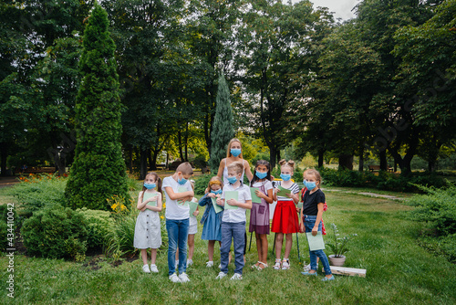 © Andrii, Obraz premium A class of masked school children is engaged in outdoor training during the epidemic. Back to school, learning during the pandemic