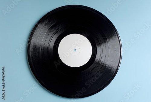 Fototapeta premium A classic black vinyl record with a blank white label is centered against a simple, solid light blue background, creating a clean, minimalist composition
