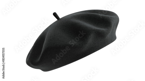 Fototapeta premium A classic black wool beret with a small stem, showcasing a timeless and elegant fashion accessory. Ideal for a sophisticated look. background removed