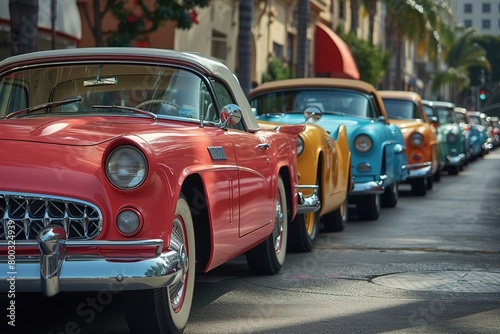 © Create image, Fototapeta premium A classic car parade, featuring a diverse lineup of vintage vehicles, each with its own unique charm