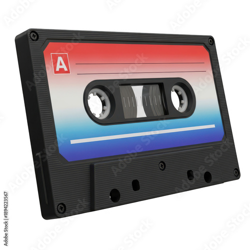 © shofique, Fototapeta premium A classic cassette tape with a red, white, and blue label, isolated on white background