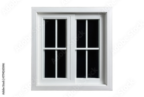 Fototapeta premium A classic double-pane window with white framing and divided glass panes, designed for residential or commercial buildings, set against a transparent background