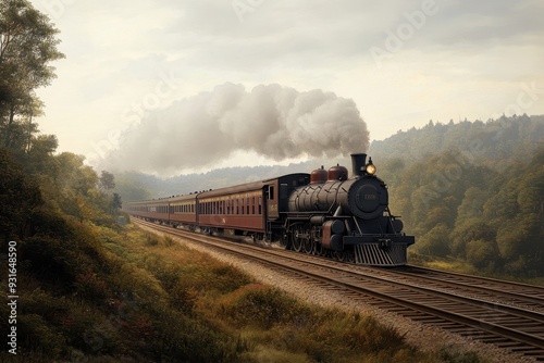 Obraz premium A classic engraving of a Victorian-era steam locomotive chugging along a...