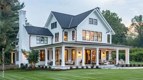 Obraz premium A classic farmhouse exterior design with white siding, black trim windows, and a covered porch for outdoor living space.