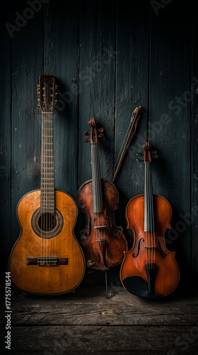 Naklejka premium A classic guitar and 2 old violin is leaning against the black wooden wall.