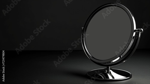 Fototapeta premium A classic round vanity mirror standing on a dark, reflective table
