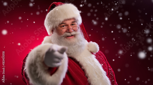 Naklejka premium A classic Santa Claus pointing directly at the viewer against a red snowy...