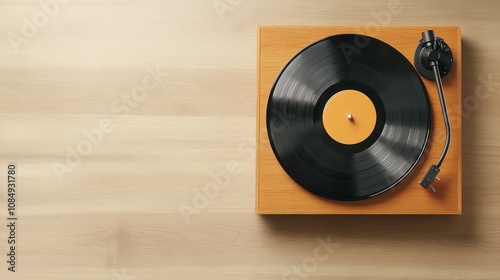 Obraz premium A classic turntable with a vinyl record sits on a wooden surface, evoking a...