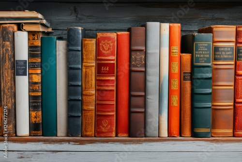 Naklejka premium A classic wooden bookshelf filled with old, leather-bound books with golden...