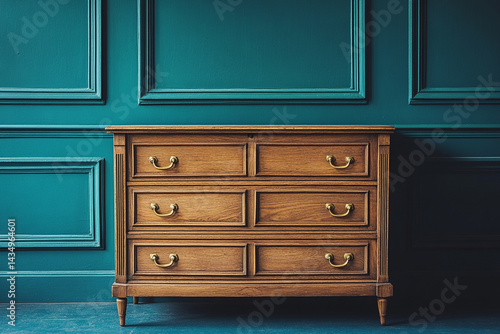 © Muhammad, Fototapeta premium A classic wooden chest of drawers with brass handles against a teal wall.