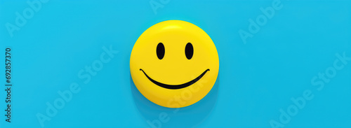 Fototapeta premium A classic yellow smiley face emoticon on a cheerful sky blue background.