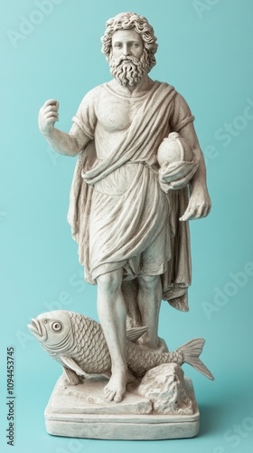 Fototapeta premium A classical statue of a bearded figure holding a fish, symbolizing abundance...