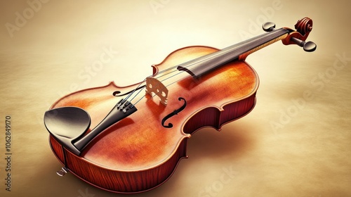 © Theeranan, Fototapeta premium A classical viola, artistically rendered in 3D, set against a warm beige tone, with intricate details on the strings highlighted in soft brown.