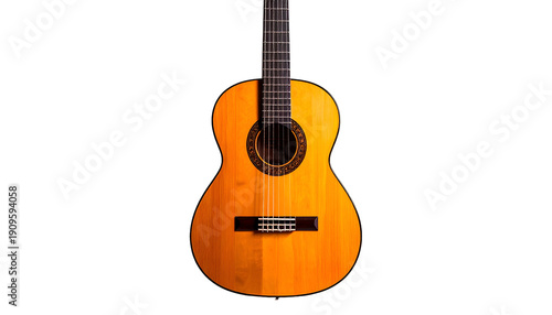© Keanu, Obraz premium A classical wooden guitar, front view, isolated against a solid black background