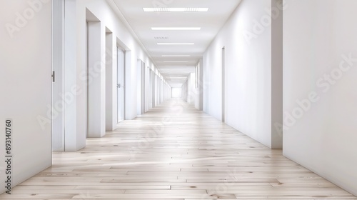 © DreamWeaver, Fototapeta premium A clean and empty school corridor with white walls and light wooden flooring