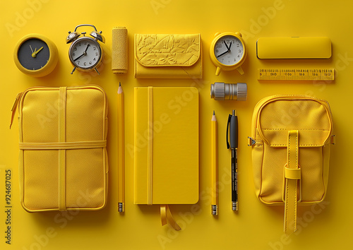 Fototapeta premium A clean and minimalistic composition of school supplies on a yellow background
