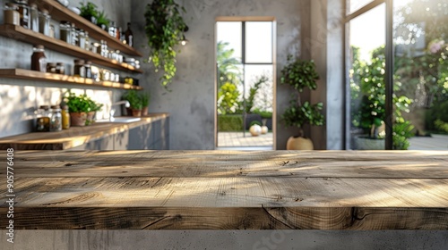 Fototapeta premium A clean and modern kitchen interior with a top wooden counter, showing a softly blurred room and bright white light. Ideal for showcasing kitchen products and creating an inviting product display
