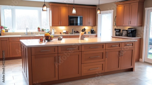 © Sawat, Fototapeta premium A clean and modern kitchen with light wood cabinets, polished counters, and an open design.