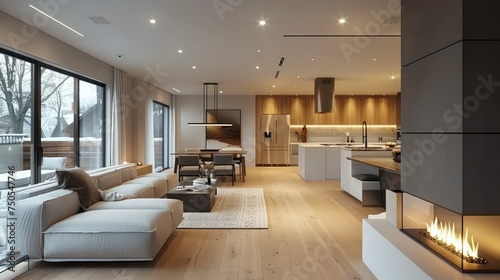 Fototapeta premium A clean and modern living room and kitchen with a fireplace. Generative AI.