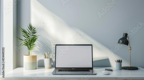 © AriyaniAI, Obraz premium A clean and modern workspace featuring a laptop, a potted plant, a desk lamp, and pencils, all bathed in natural sunlight.