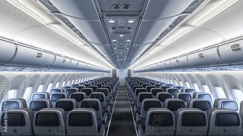 Fototapeta premium A clean and spacious economy class airplane cabin with rows of comfortable...