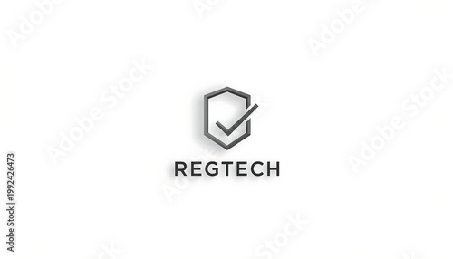© Masaji, Fototapeta premium A clean 3D rendered logo shows a dark grey hexagon shield with a prominent checkmark and the word "REGTECH" below.