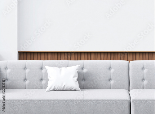 © FIDDA, Naklejka premium A clean, modern living room featuring a neutral-colored sofa with a centered blank pillow, perfect for mockups.