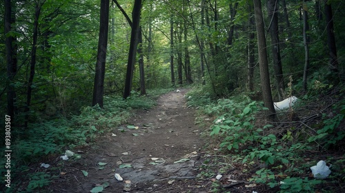 Fototapeta premium A clean, well-maintained hiking trail through a dense forest, free from any plastic bags or litter, symbolizing environmental conservation.