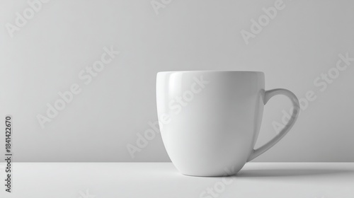 Obraz premium A clean, white ceramic mug sits on a plain white surface, against a soft gray...