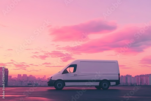 © adobestocker1, Fototapeta premium A clean white delivery van under pastel pink skies at sunrise in an urban setting. picture