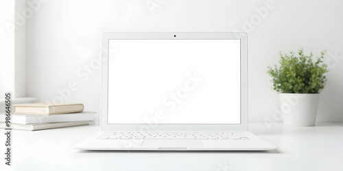 Obraz premium A clean white workspace featuring a sleek laptop, minimalist decor, and ample...