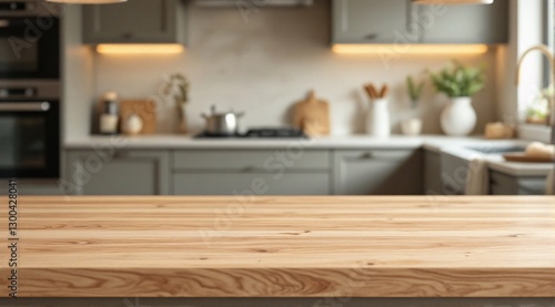 © Studio VIP, Fototapeta premium A clean wooden kitchen table with a sharp focus in the foreground, with a modern minimalist kitchen faintly visible in the background.